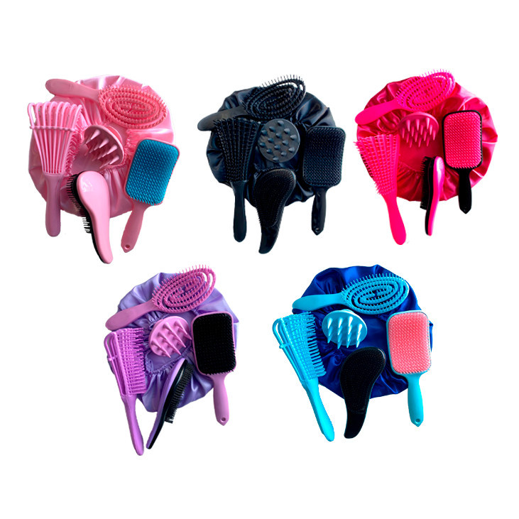 Kit com 5 Escovas - Raquete Fashion Flex + Escova Mágica + Escova Polvo + Escova Massageadora de Silicone e Touca de Cetim